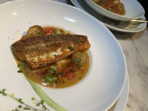 凝縮した魚のスープと熱々の魚のポワレと白ワインで